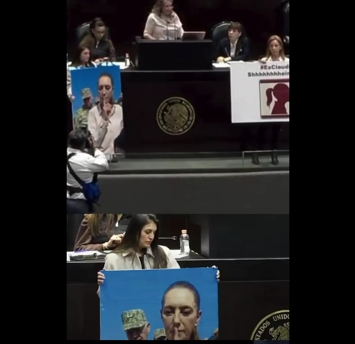 Se discutía la reforma a la Ley de amparo, y Rocío González, llevó hasta la tribuna del Congreso Federal una luna donde se ve a Claudia Sheinbaum recurriendo al “shh” como la onomatopeya, silenciando a la población en Veracruz desde una pick up y custodiada por elementos militares, además de amenazar con irse si no se callaban.