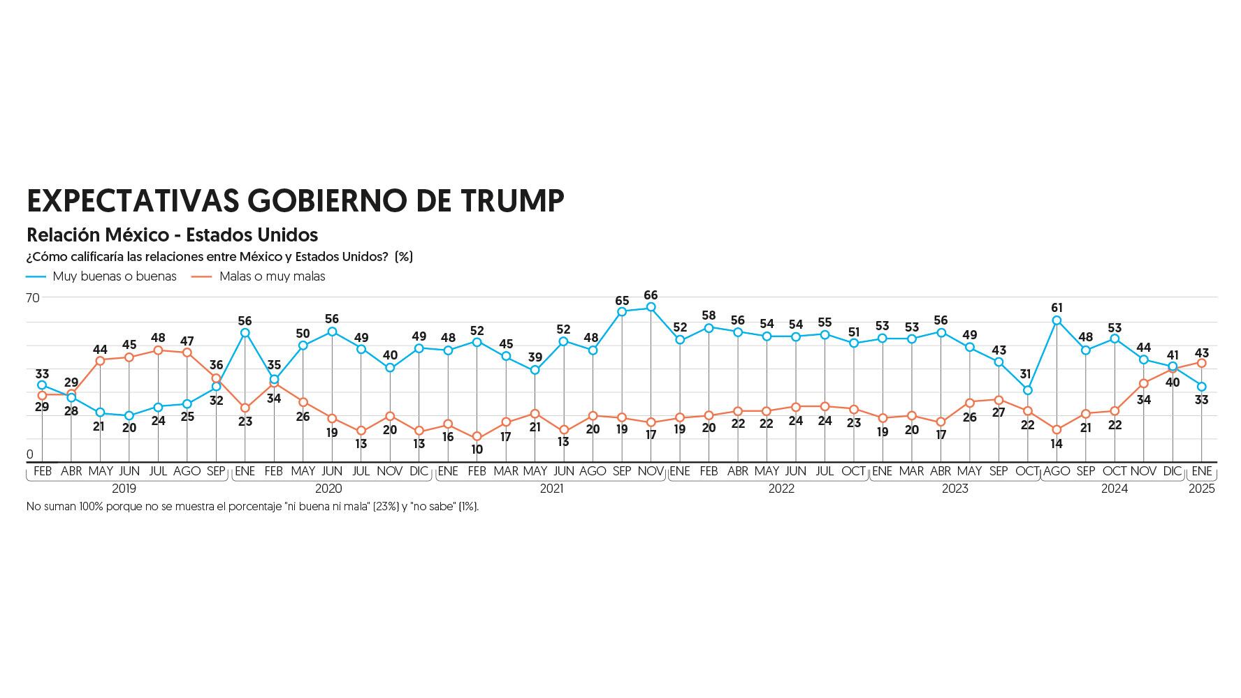 La opinión negativa acerca de las relaciones con Estados Unidos no había estado por arriba de 40 por ciento desde 2019, cuando Trump todavía era presidente en su anterior periodo. Acorde con estos datos, la opinión pública mexicana ha mostrado pesimismo hacia la relación con el vecino país.