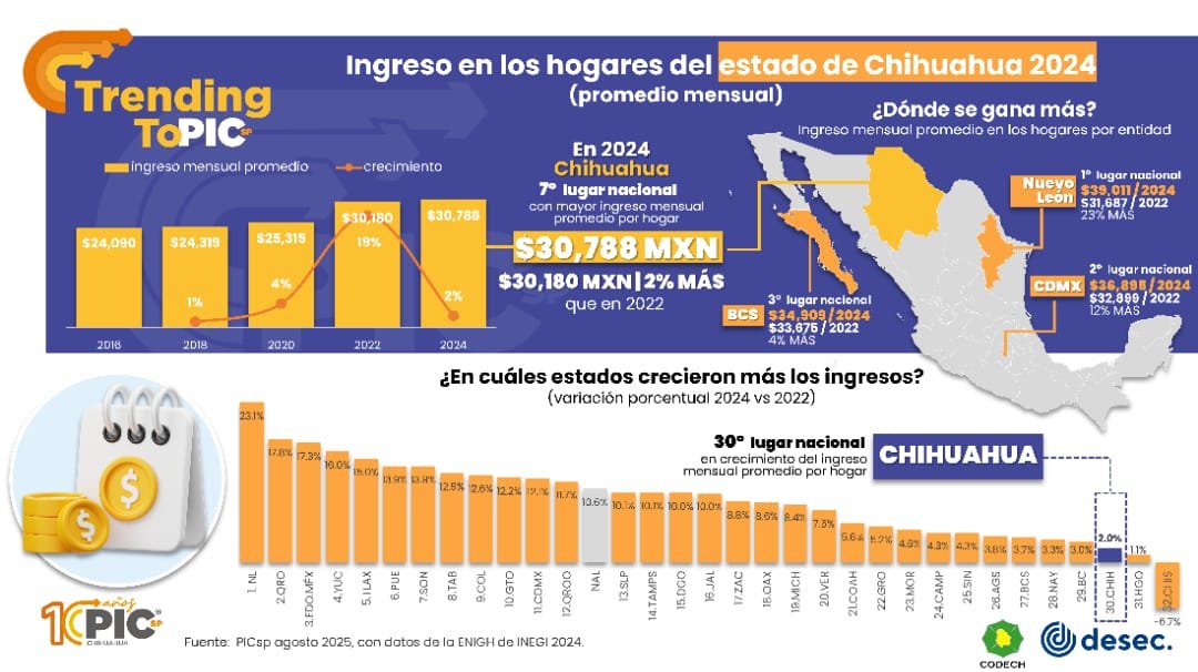 La Plataforma de Inteligencia Competitiva del Sector Privado dio a conocer que Chihuahua se encuentra en el séptimo lugar a nivel nacional en ingresos mensuales por hogar, esto según datos del INEGI 2024.