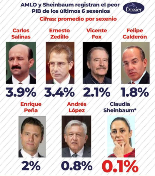 Con el entonces presidente Andrés Manuel López Obrador, la economía en su sexenio tuvo un crecimiento del 0.8 por ciento, mientras en lo que va de la administración de Claudia Sheinbaum se ha alcanzado un 0.1 por ciento.