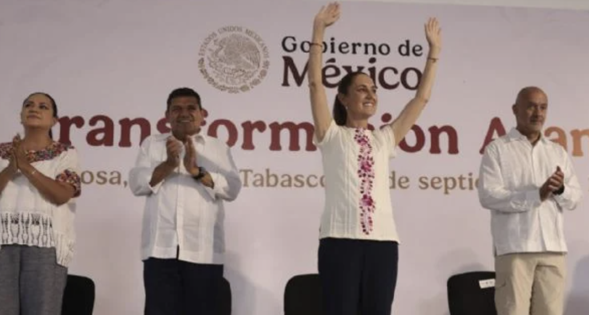 La mandataria nacional realizó una gira de trabajo por la entidad, en la que aseguró que se recuperó la inversión en obra pública en Tabasco, e indicó que se construye el Tren Interoceánico con un ramal hacia la refinería de Dos Bocas.