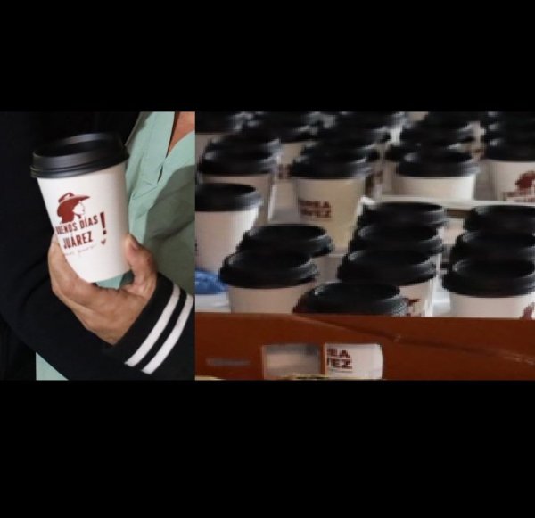Los vasos del café de Andrea Chávez muestran su nombre, la imagen de una sombra de una mujer portando un sombrero y la leyenda "Buenos días Juárez".