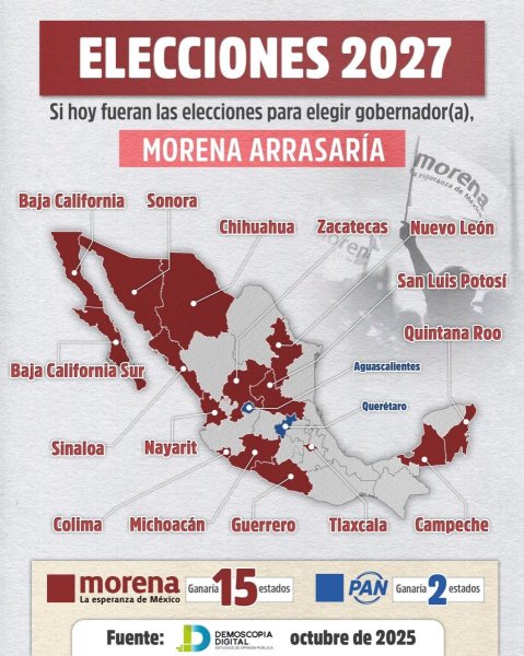 Publicó en redes sociales: De acuerdo con las últimas mediciones, así luce el panorama de cara al proceso electoral de 2027. Si hoy fueran las elecciones, nuestro Movimiento triunfaría en 15 de los 17 gobiernos estatales en disputa. Todo nuestro agradecimiento al pueblo de México por su confianza. No la vamos a traicionar.