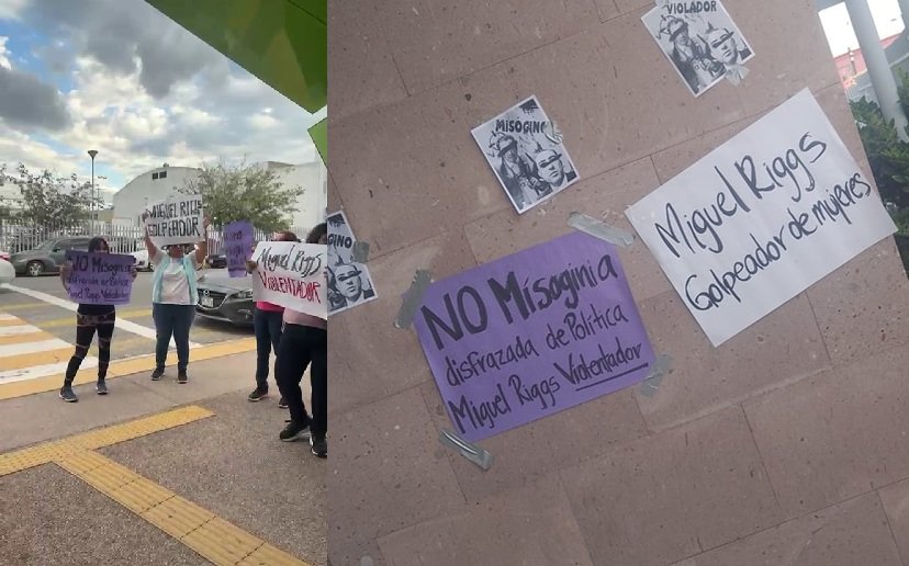 Las mujeres, aunque reducido en grupo, bloquearon con cartulinas y pegaron imágenes contra el regidor Miguel Riggs, la entrada principal al edificio.