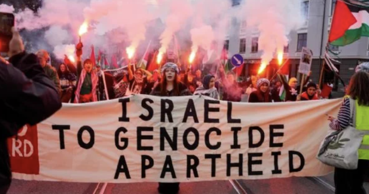 La emisora ??pública NRK dijo que alrededor de mil manifestantes llegaron al estadio Ullevaal de Oslo. Los manifestantes portaban una pancarta sobre la guerra en Gaza en lo que parecía ser una marcha pacífica.