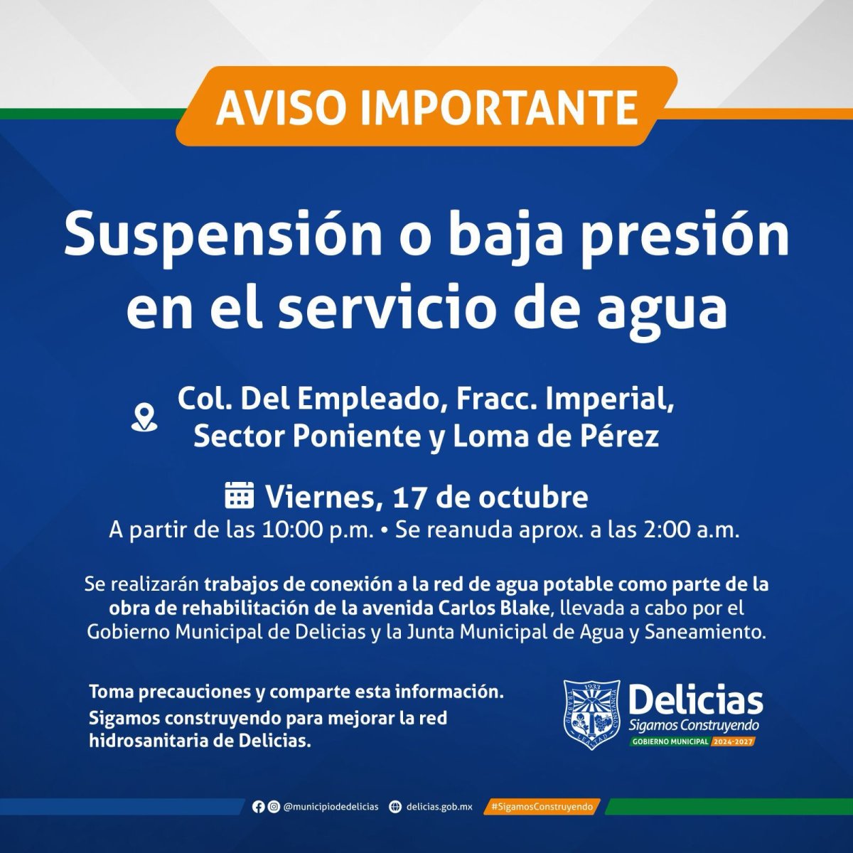 El Gobierno Municipal de Delicias informó que este viernes 17 de octubre se llevará a cabo una suspensión temporal o baja presión en el servicio de agua potable que podría afectar la zona Norte y Poniente de la ciudad, debido a los trabajos de integración de la nueva red de agua potable como parte de la rehabilitación integral de la avenida Carlos Blake.