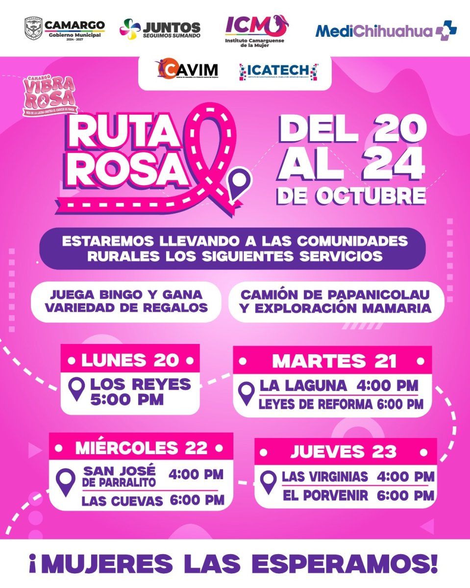El Gobierno Municipal de Camargo, en coordinación con el Instituto Camarguense de la Mujer (ICMU), CAVIM, ICATECH y MediChihuahua, anunció el arranque de la “Ruta Rosa”, una campaña que busca acercar servicios de salud preventiva a las mujeres de las comunidades rurales.