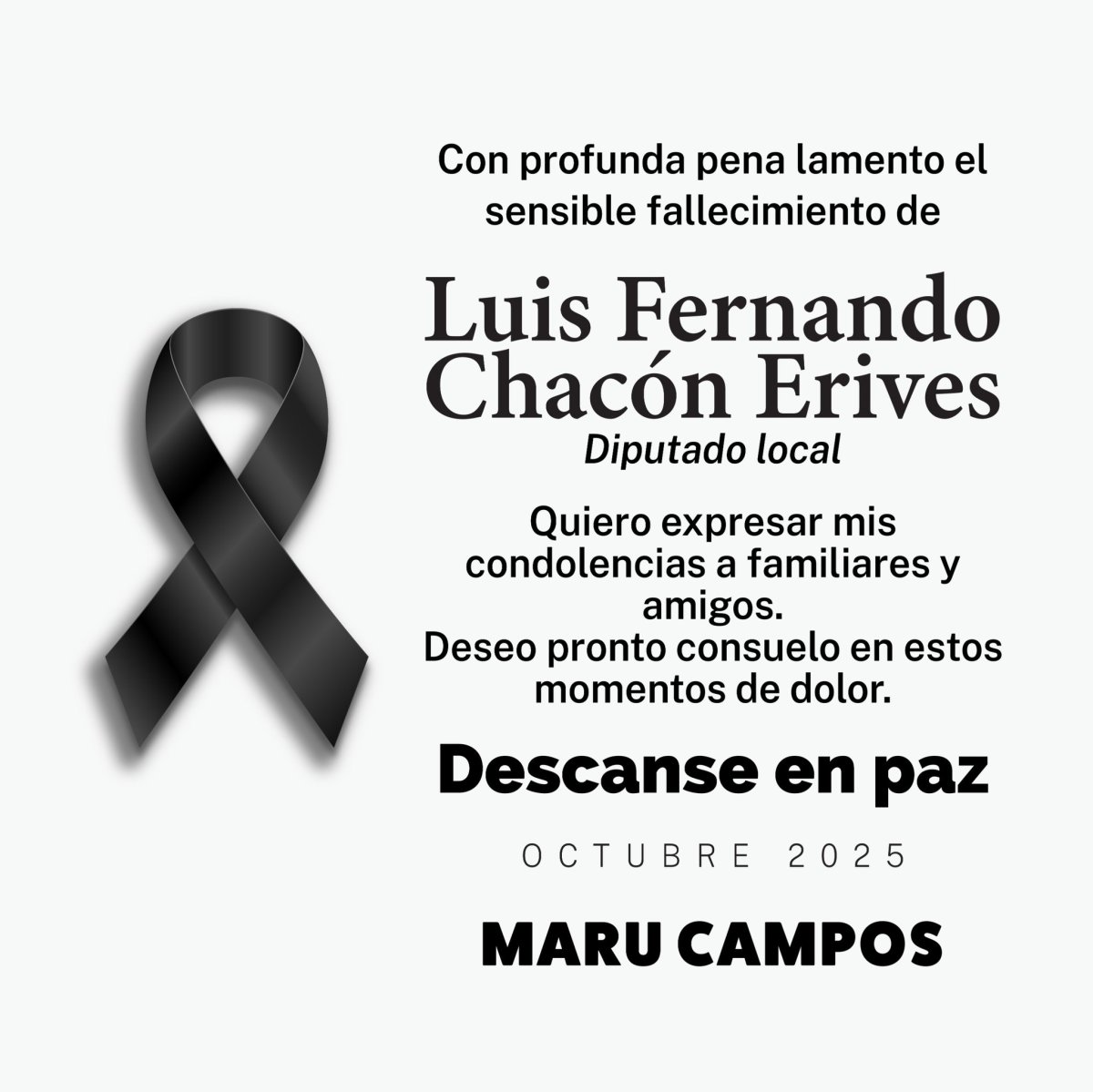 La gobernadora Maru Campos, a través de la red social X, emitio sus condolencias por el lamentable fallecimiento del joven diputado, Luís Fernando Chacón.