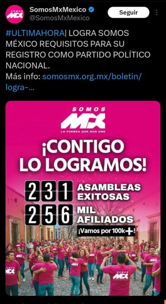A través de redes sociales, Somos MX presumió que ya cuenta con los requisitos necesarios para su registro como partido político a nivel nacional. En el post de X, compartieron que este fin de semana alcanzaron las 231 asambleas y 256 mil afiliados.
