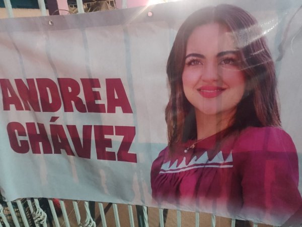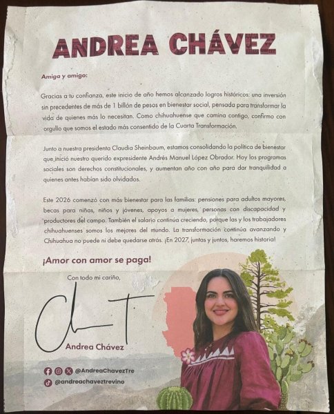 En la ciudad de Chihuahua circulan volantes de Andrea Chávez, con su imagen, vistiendo una blusa indígena, con un nopal y el mapa del Estado de fondo, e incluye la frase “en 2027, juntas y juntos haremos historia”, que recuerda la coalición electoral de MORENA, PT y el extinto PES oportunista, que postularon a AMLO en 2018.