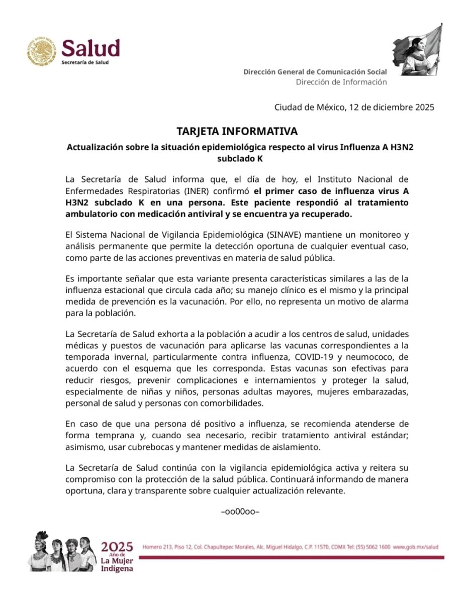 La Secretaría de Salud confirmó la detección del primer caso en México de influenza A H3N2 subclado K, identificado por el Instituto Nacional de Enfermedades Respiratorias. Según la dependencia, la persona afectada recibió tratamiento antiviral de manera oportuna y ya se encuentra recuperada, mientras que se mantiene un monitoreo constante para identificar cualquier comportamiento inusual del virus. Las autoridades señalaron que esta variante conserva características similares a la influenza estacional que circula cada año, por lo que no representa un riesgo adicional para la población y su atención médica sigue los mismos lineamientos.
