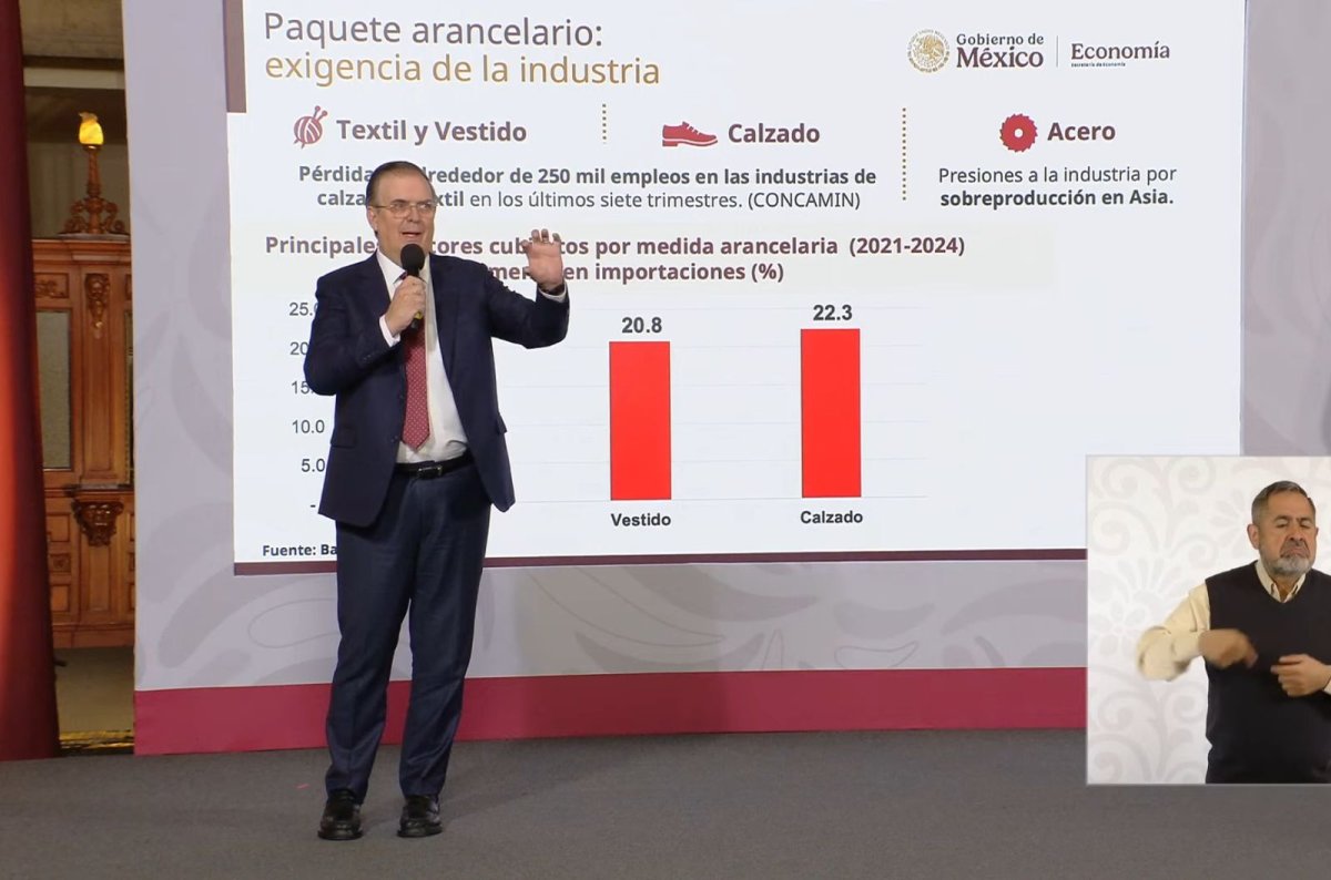 El Secretario de Economía, Marcelo Ebrard, compartió los pormenores del paquete arancelario que se aprobó en días pasado en San Lázaro, Ebrard aseguró que esto se hizo par salvar 350 mil empleos en México.