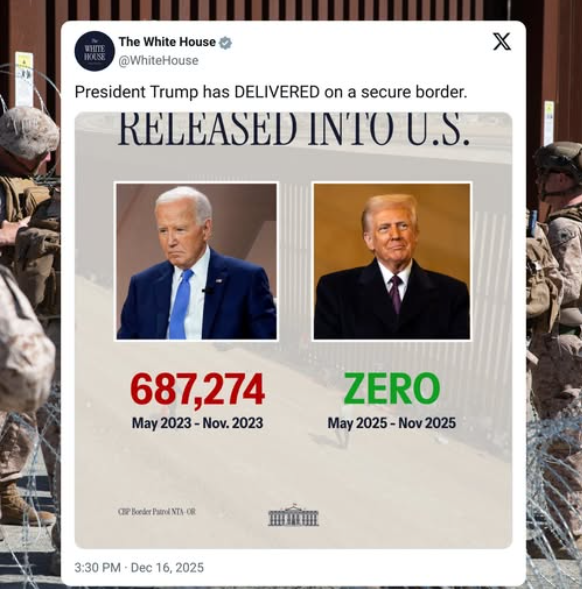 -Cero liberaciones en libertad condicional , en comparación con las 7,185 liberadas por la Patrulla Fronteriza bajo la administración de Biden a lo largo de la frontera suroeste en noviembre de 2024