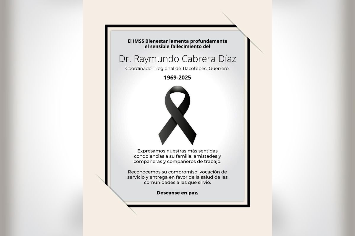 “El IMSS Bienestar lamenta profundamente el sensible fallecimiento del Dr. Raymundo Cabrera Díaz, coordinador regional de Tlacotepec, Guerrero”, indicó.
