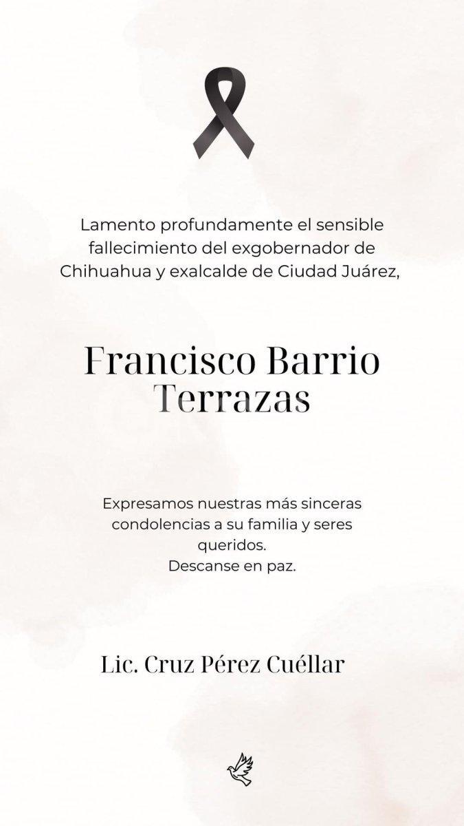 "Lamento profundamente el sensible fallecimiento del exgobernador de Chihuahua y exalcalde de Ciudad Juárez, Francisco Barrio Terrazas. Expresamos nuestras más sinceras condolencias a su familia y seres queridos. Descanse en paz", expresó, Cruz Pérez Cuéllar.