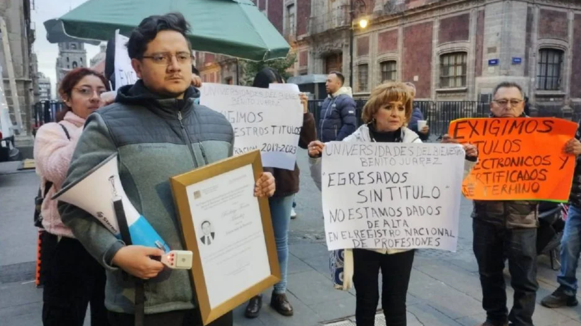 Exalumnos de la licenciatura en Derecho de las Universidades para el Bienestar Benito Juárez García protestaron la mañana de este miércoles frente a los accesos de Palacio Nacional para denunciar que, pese a haber concluido sus estudios, no pueden ejercer su profesión debido a que su historial académico, certificados y títulos no han sido dados de alta ante la Dirección General de Profesiones.