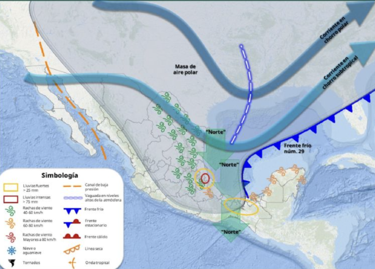 Mientras tanto, la masa de aire polar que impulsa al sistema seguirá generando evento de “Norte” intenso con rachas de hasta 100 kilómetros por hora en el istmo de Tehuantepec y con oleaje de hasta 4.5 metros de altura en el golfo de Tehuantepec, y fuerte con rachas de viento de 40 a 60 km/h con oleaje de hasta 3 metros de altura en Tamaulipas, Veracruz, Tabasco, Campeche, Yucatán y Quintana Roo.