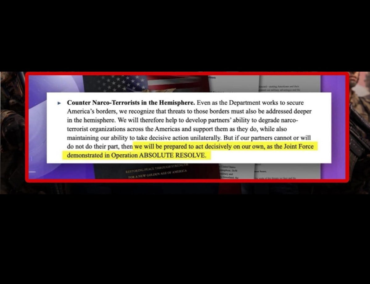 El documento señala: “Ayudaremos a nuestros aliados a desarrollar la capacidad de degradar a las organizaciones narcoterroristas en el continente americano. Pero si nuestros aliados no quieren o no pueden, estaremos preparados para actuar solos, como se demostró en la operación Absolute Resolve (captura de Nicolás Maduro)”