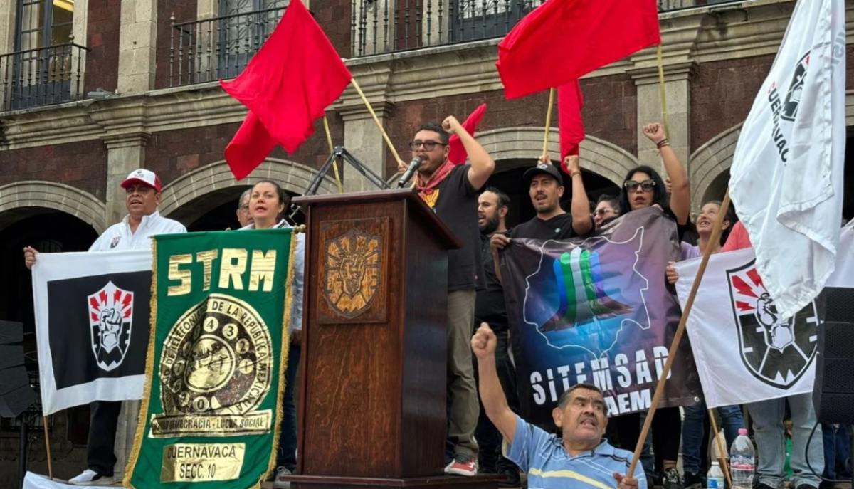 Al llegar a la Plaza de Armas, se realizó un mitin en el que se dio lectura a un pronunciamiento conjunto a nombre del Frente Social en Defensa de los Derechos de los Trabajadores al Servicio del Estado, también identificado como Colectivo Amplio Morelos, articulación que agrupa a sindicatos y organizaciones sociales del estado.