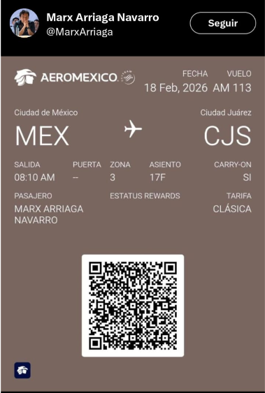 En la imagen compartida, se observa un boleto de avión de Ciudad de México a Ciudad Juárez, el cual salió a las 8:10 a.m..Cabe mencionar que Arriaga fue visto hace unos minutos en el aeropuerto de la ciudad fronteriza en donde ya lo esperaba un grupo de personas quienes le reclamaron por la creación de los libros de texto.
