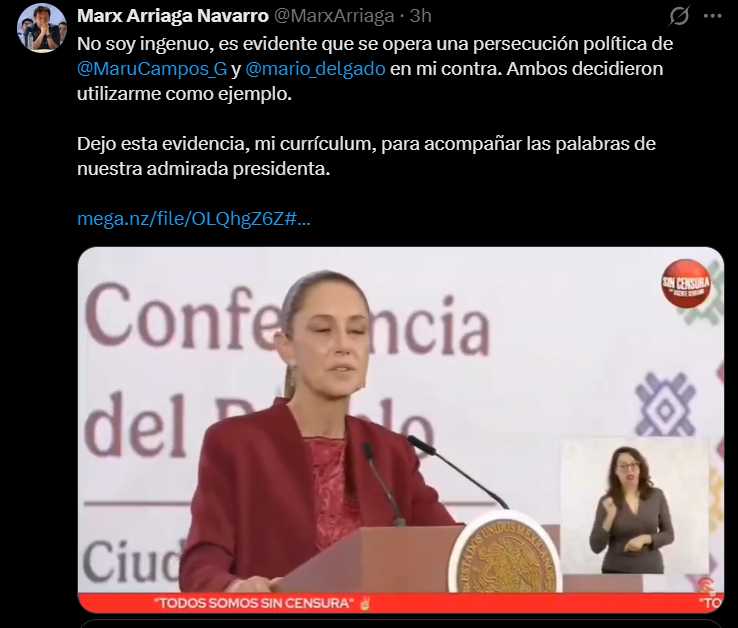 El ex funcionario federal Marx Arriaga Navarro denunció a través de su cuenta en la red social X una presunta persecución política en su contra, señalando directamente a la gobernadora de Chihuahua, Maru Campos, y al dirigente nacional de Morena, Mario Delgado.