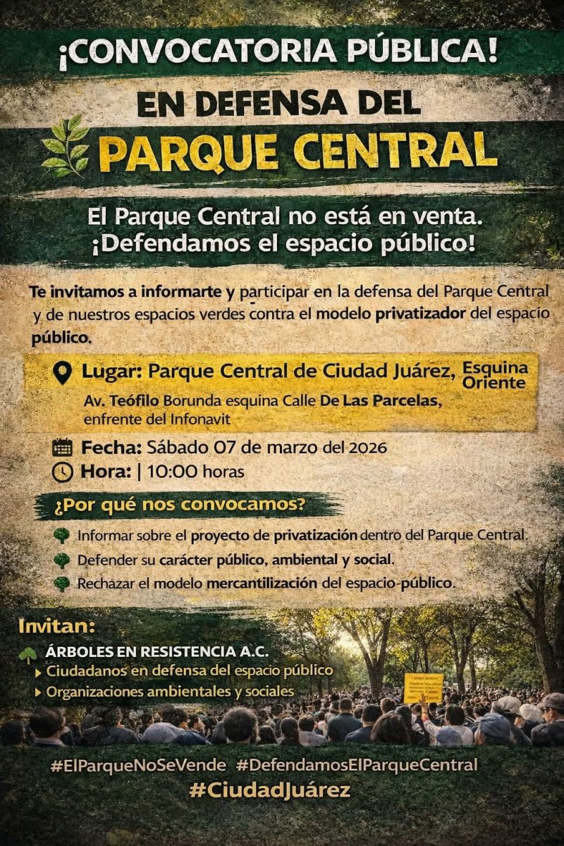 La asociación Árboles en Resistencia A.C. convocó a la ciudadanía a una reunión pública para informar, dialogar y organizar acciones en defensa del Parque Central de Ciudad Juárez, ante el proyecto que pretende instalar un Oxxo.