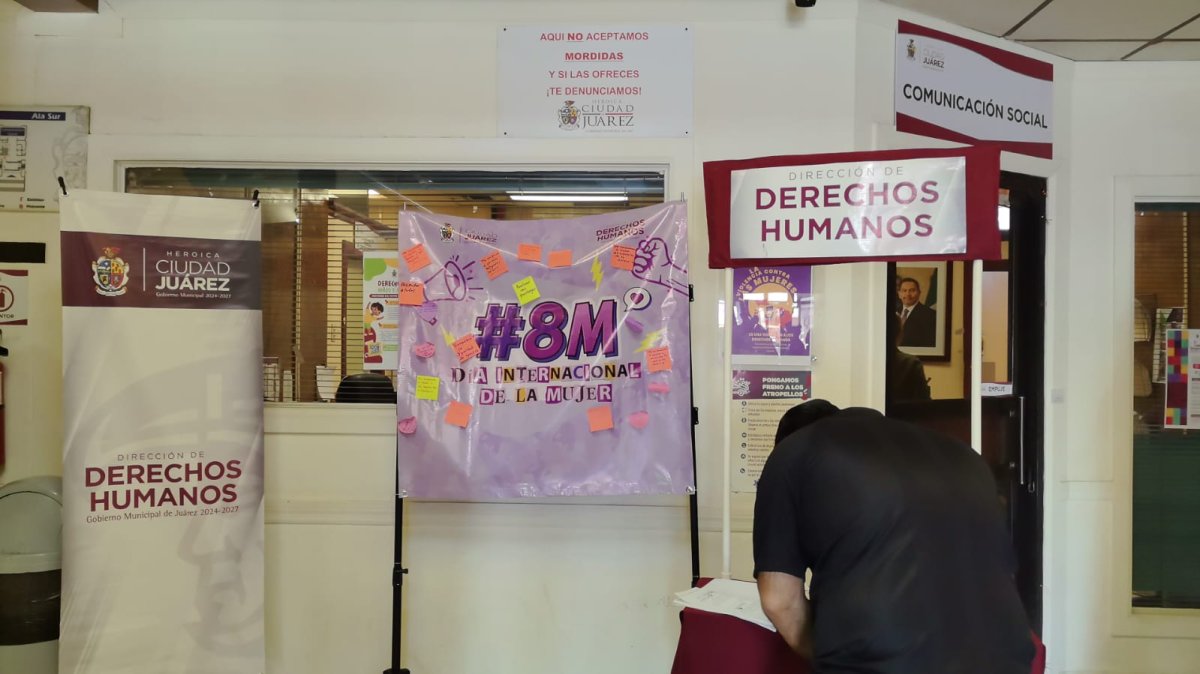 Esta mañana fue instalada una lona conmemorativa del #8M Día Internacional de la Mujer en las oficinas de la Dirección de Derechos Humanos del Municipio, donde se invita a servidores y servidoras públicas, así como a la ciudadanía, a sumarse a la actividad de compromisos en favor de la igualdad y el respeto a los derechos de las mujeres.