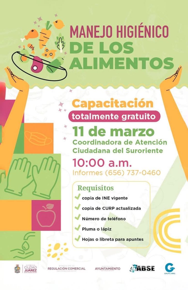 La Dirección de Regulación Comercial, encabezada por Oscar Guevara, continúa apoyando a los comerciantes de Ciudad Juárez con el curso de Manejo Higiénico de los Alimentos, ahora en el sector sur-oriente. Este es el sexto curso impartido y más de 100 comerciantes se dieron la tarea de tomar este curso gratuito.