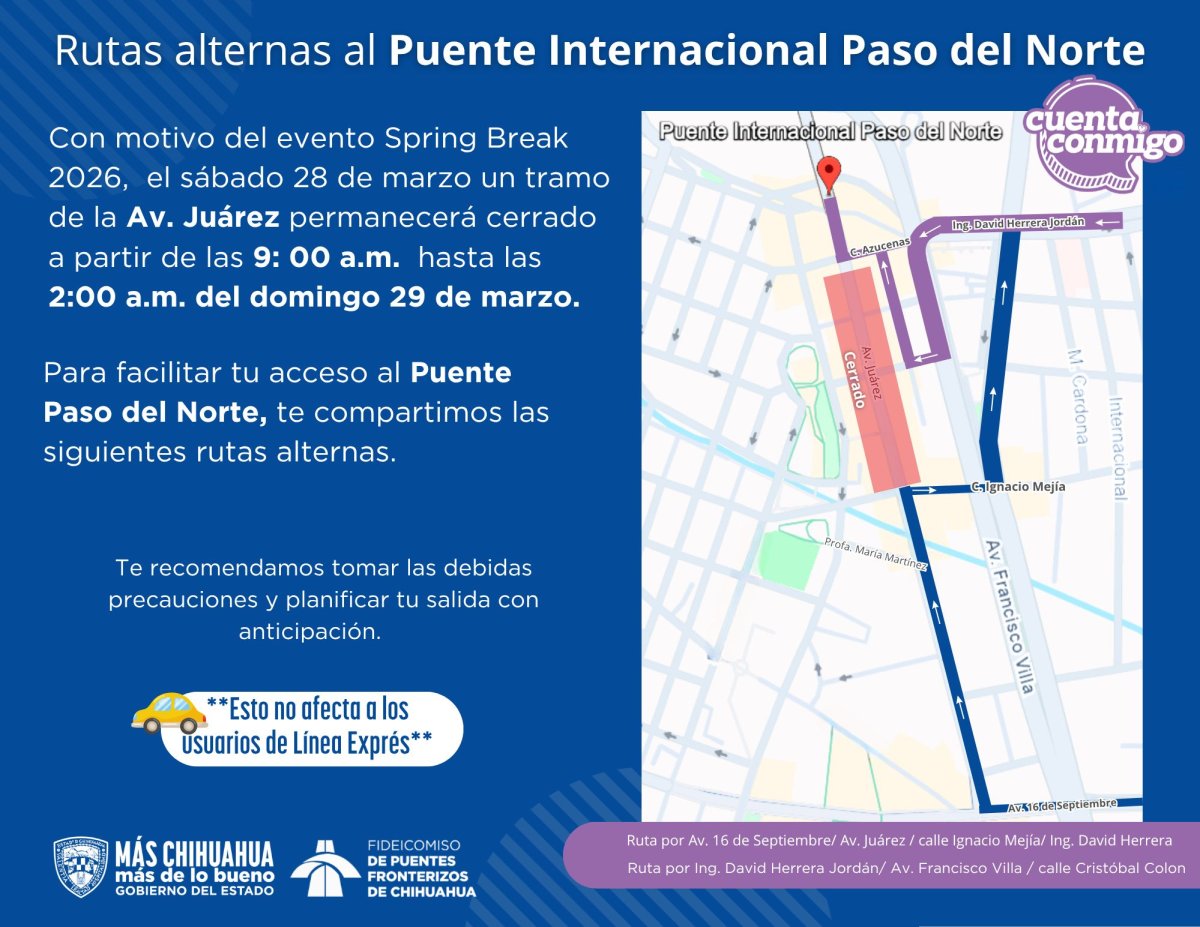 Con motivo del evento Spring Break 2026, un tramo de la avenida Juárez permanecerá cerrado desde las 9:00 de la mañana de este sábado 28 de marzo y hasta las 2:00 de la madrugada del domingo 29, informaron autoridades estatales.