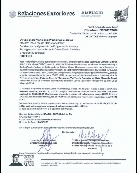 La Agencia Mexicana de Cooperación Internacional para el Desarrollo (AMEXCID) ha emitido una solicitud de pago por un monto de 1Millón 479 mil pesos a favor de la empresa DRAGON CHARGE, S.A de C.V.