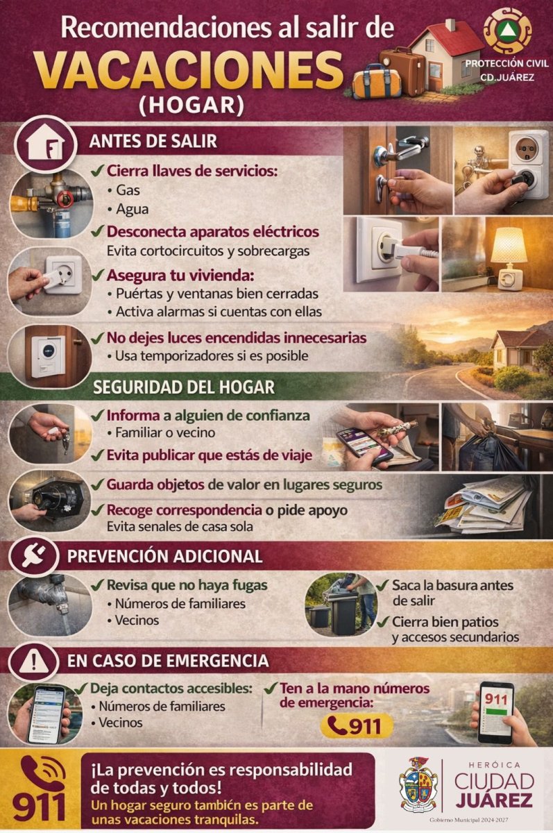 Ante el periodo vacacional, la Dirección General de Protección Civil en Ciudad Juárez hizo un llamado a tomar precauciones básicas para evitar incidentes en los hogares que quedan solos.