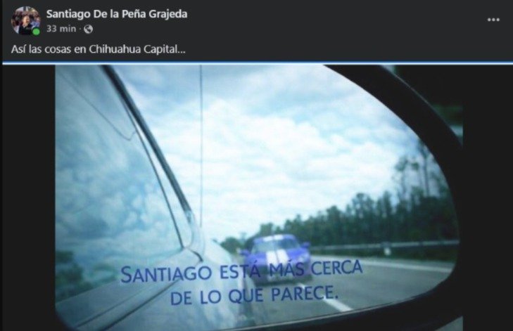 Acompañó la publicación con una imagen de un espejo lateral izquierdo en plena carrera vehicular, con el mensaje “Santiago está más cerca de lo que parece”, rematada con un “así las cosas en Chihuahua capital”, publicación directa y nada inocente…