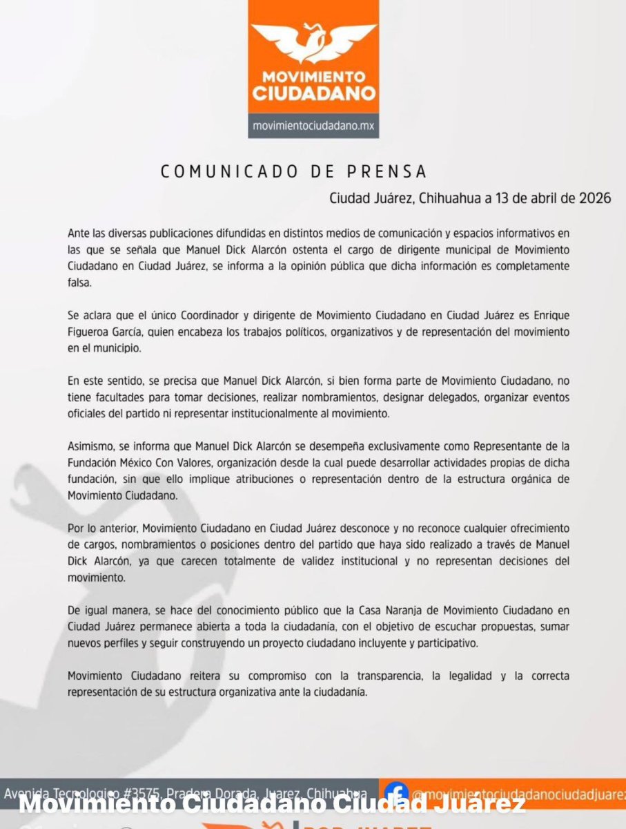 En ese sentido, se precisó que Manuel Dick Alarcón sí forma parte del movimiento; sin embargo, no cuenta con facultades para tomar decisiones internas, realizar nombramientos, designar delegados ni representar institucionalmente al partido.