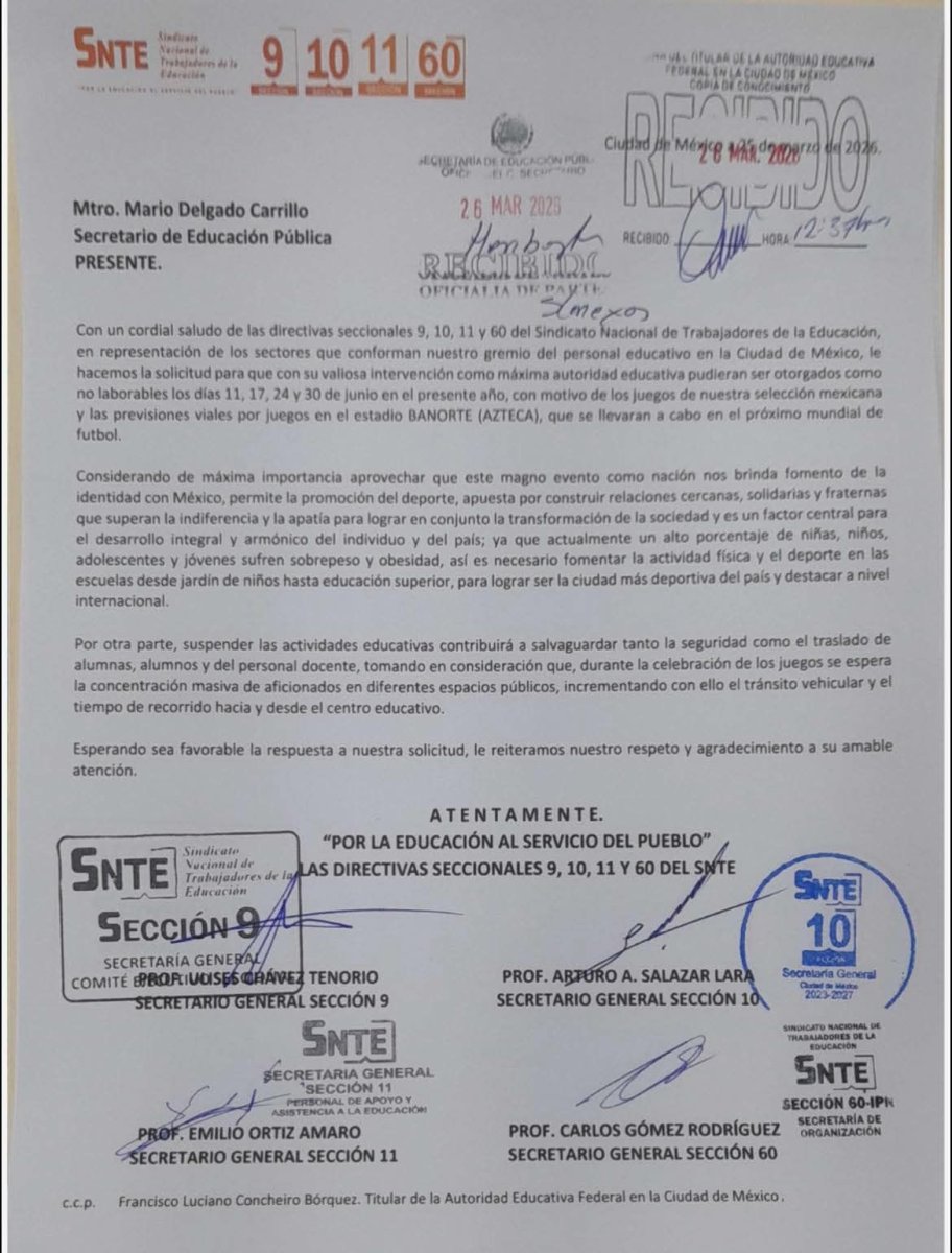 Las secciones 9, 10, 11 y 60 del SNTE en la Ciudad de México solicitaron a la SEP suspender clases los días 11, 17, 24 y 30 de junio, debido a la movilidad y concentración masiva de personas que generarán los partidos del Mundial de futbol en la capital.