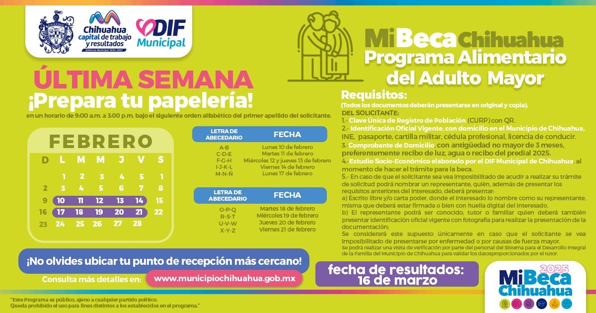 La lista de las personas beneficiarias será publicada el domingo 26 de marzo del 2025, en periódicos de mayor circulación o en la página web del Gobierno Municipal: http://www.municipiochihuahua.gob.mx y en las redes sociales de DIF Municipal https://www.facebook.com/DIFmunicipalcuu. En dicha publicación se dará a conocer lo referente a cerca de los centros de entrega de apoyos.