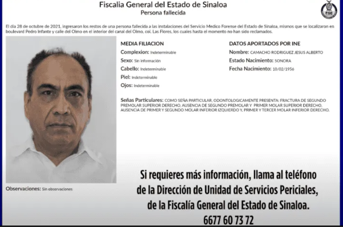 Camacho Rodríguez desapareció sin dejar rastro y ha sido encontrado por el colectivo quien ha publicado su nombre en una lista para que sus familiares reclamen sus restos en el Servicio Médico Forense (Semefo) de Culiacán, Sinaloa.
