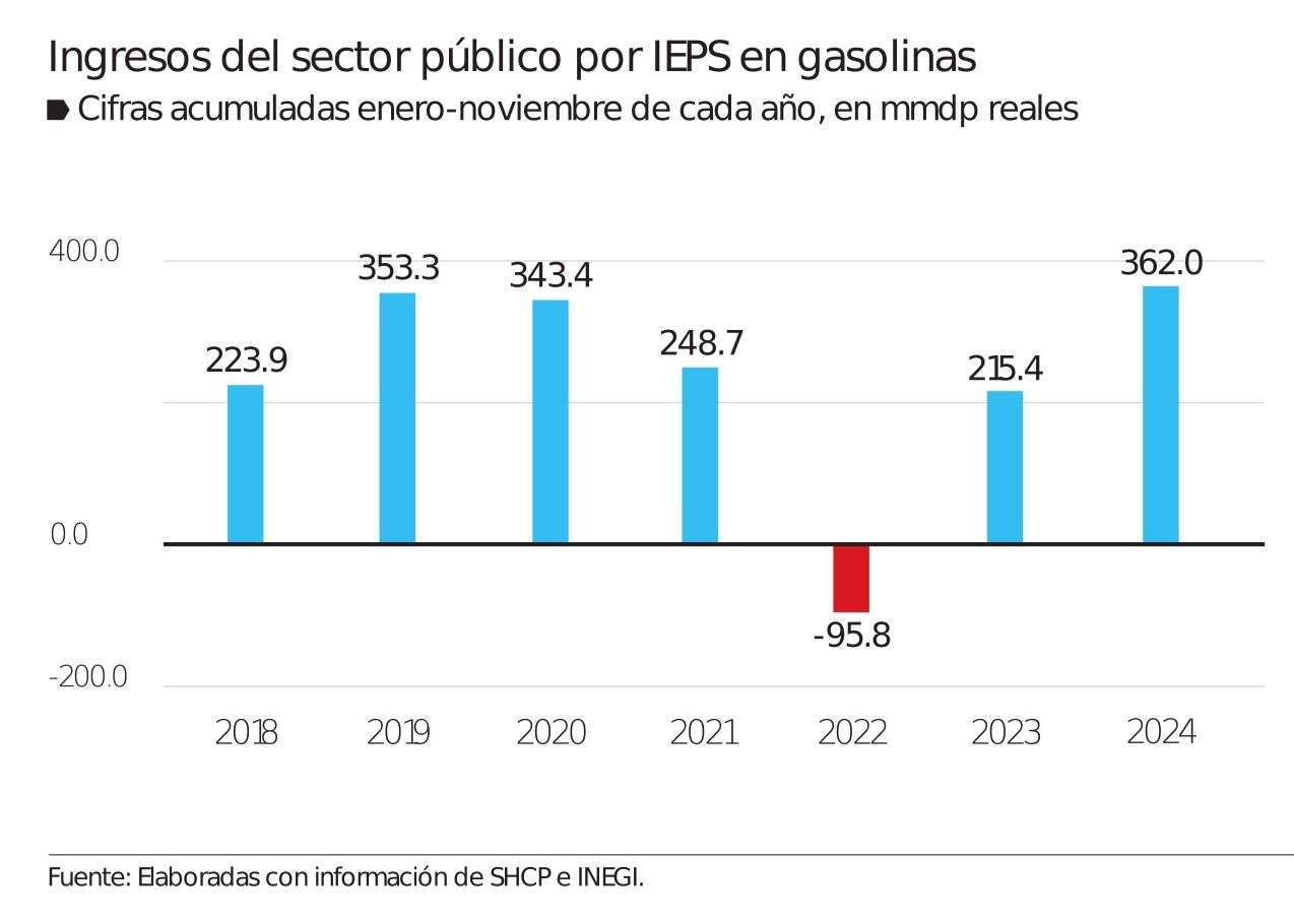 Sin embargo, explicó que la estrategia de estabilizar el precio de la gasolina mediante estímulos fiscales tenía sentido cuando se tenían más ingresos petroleros, ya que se compensaba la pérdida recaudatoria del IEPS, pero conforme más cae la producción y se reduce la carga fiscal de Pemex, esta estrategia ya no será igual de efectiva.