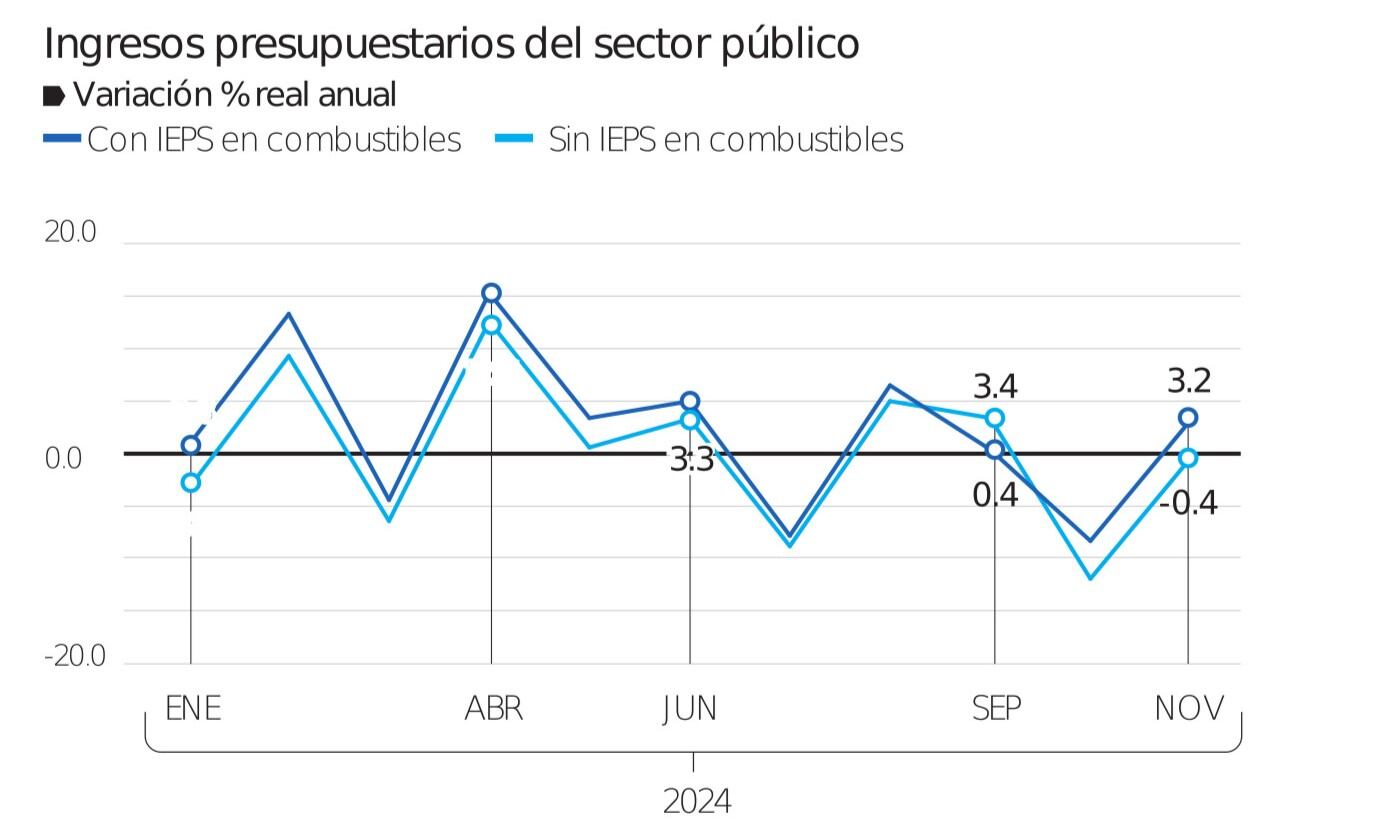 Este repunte impulsó la recaudación del periodo; de acuerdo con la Secretaría de Hacienda, los ingresos tributarios crecieron 6.2 por ciento a noviembre, a tasa anual, pero sin considerar los ingresos del IEPS de combustibles, el avance resultó de apenas 2.9 por ciento, de acuerdo con el reporte de Finanzas Públicas y deuda pública.