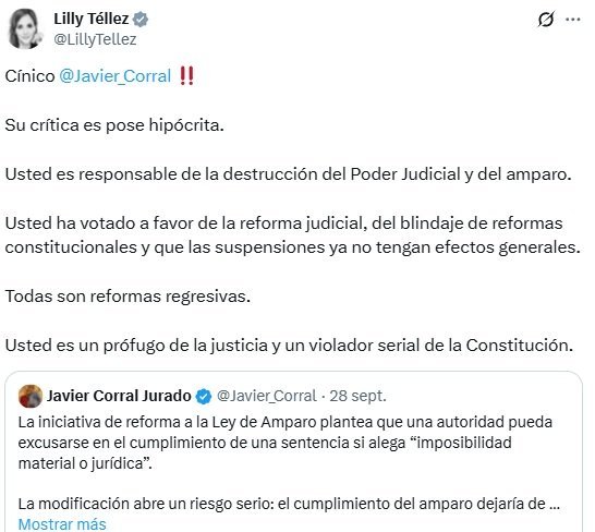 Lilly Téllez le comentó " Cínico @Javier_Corral Su crítica es pose hipócrita. Usted es responsable de la destrucción del Poder Judicial y del amparo. Usted ha votado a favor de la reforma judicial, del blindaje de reformas constitucionales y que las suspensiones ya no tengan efectos generales. Todas son reformas regresivas. Usted es un prófugo de la justicia y un violador serial de la Constitución".