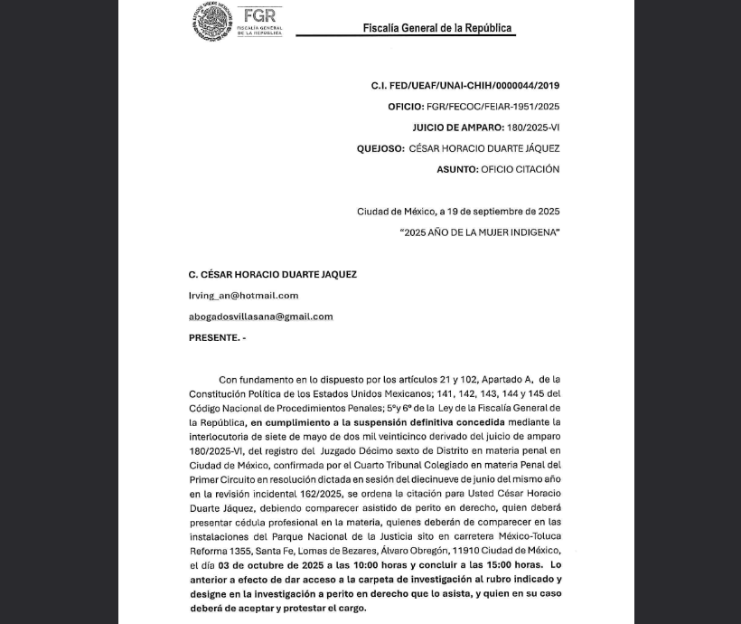 Esto después de que dicho amparo se registrará en el Juzgado Décimo Sexto de Distrito y posteriormente se confirmara por el Cuarto Tribunal Colegiado en Materia Penal del Primer Circuito, por lo que esta mañana tanto Duarte como un perito deberán estar presentes para comparecer.