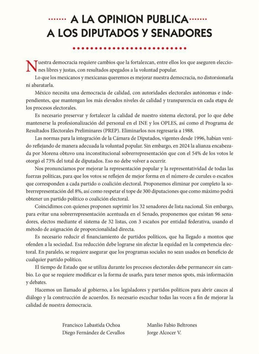 Este documento fue firmado por Francisco Labastida, Diego Fernández de Cevallos, Manlio Fabio Beltrones y Jorge Alcocer Villanueva, por lo que la presidenta Sheinbaum criticó fuertemente esta carta, pues aseguró que todos son creación de Salinas de Gortari.